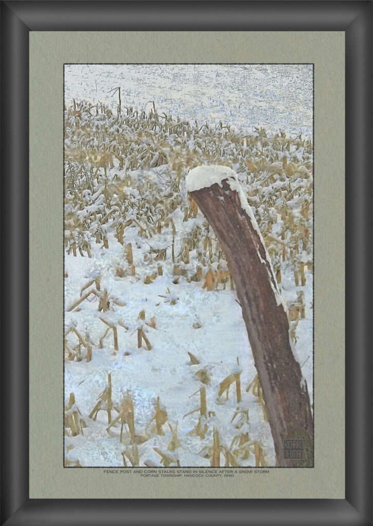 This Hancock County Ohio snow covered corn field watercolor presents a close view of a winter field following a recent storm. A leaning fence post emerges from the foreground, surrounded by broken corn stalks partially buried beneath fresh snow.